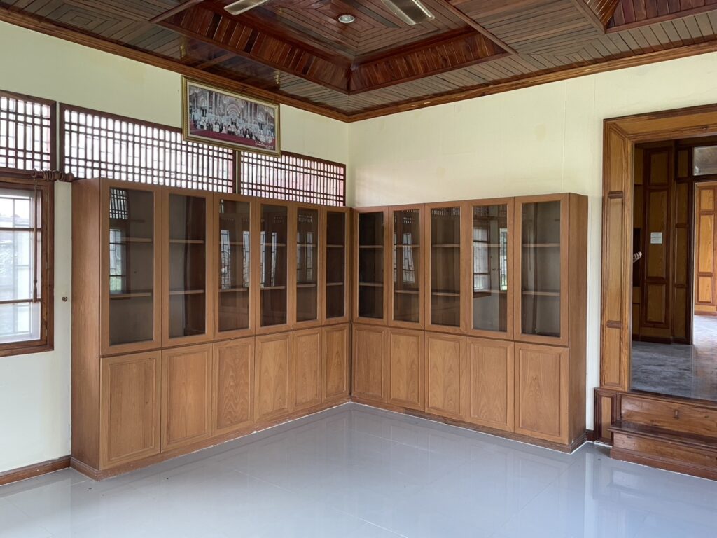 - ห้องสมุดส่วนตัว บิ้วอินไม้ประดู่ พร้อมตู้หนังสือและฝ้าไม้สุดคลาสสิก