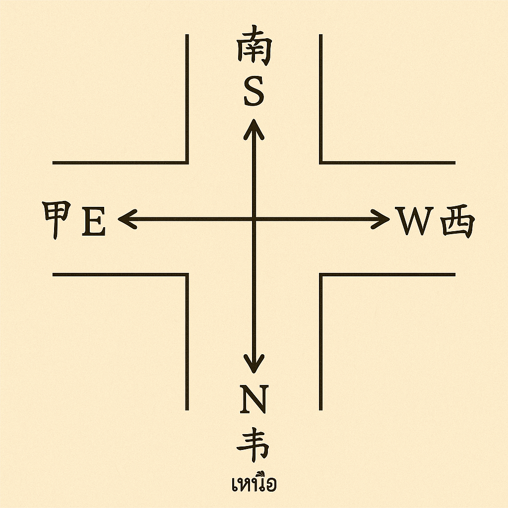 N = ทิศเหนือ, S = ทิศใต้, W = ตะวันตก, E = ตะวันออก